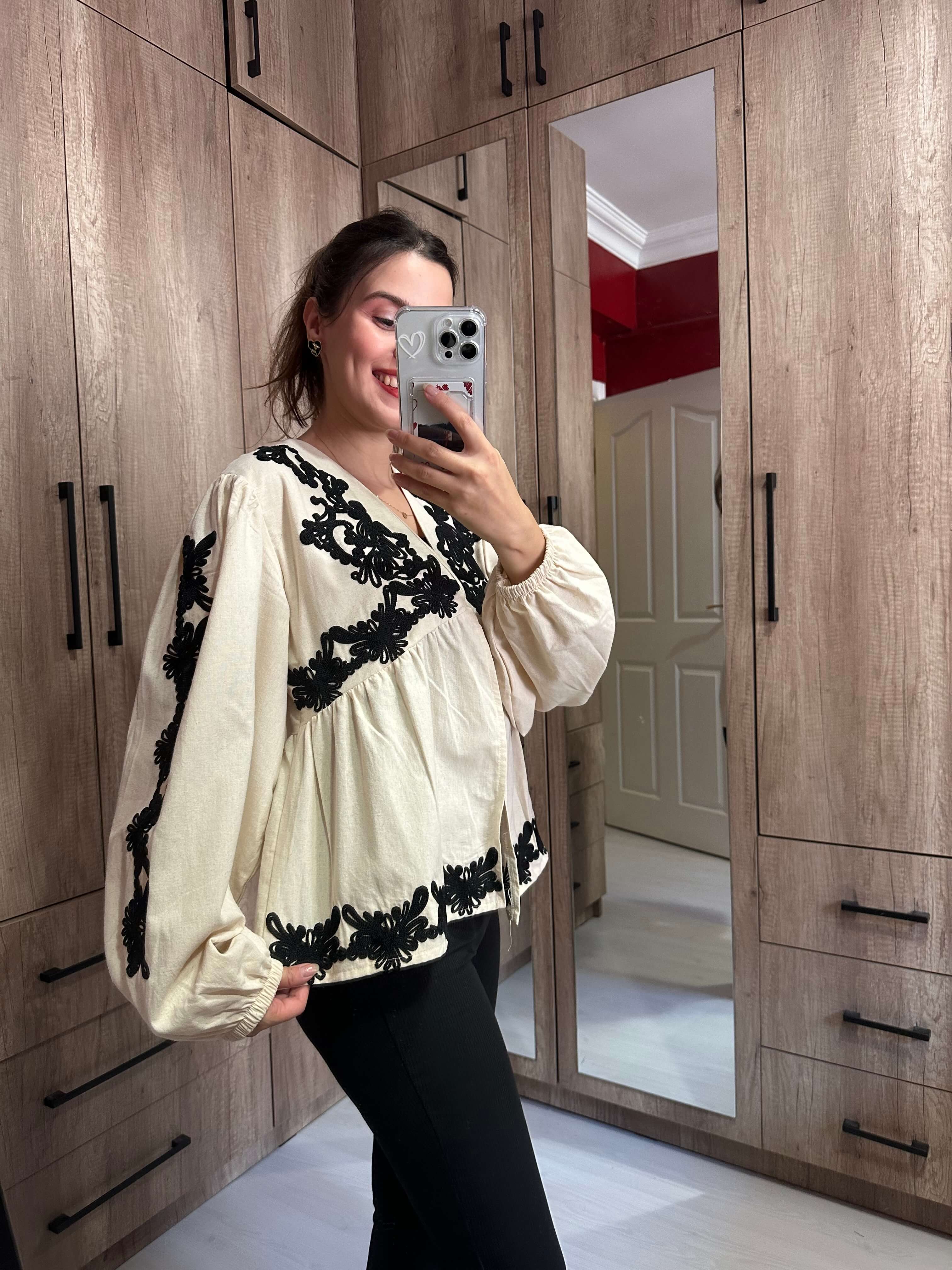 Siyah İşlemeli Ön Bağlamalı Bej Gömlek