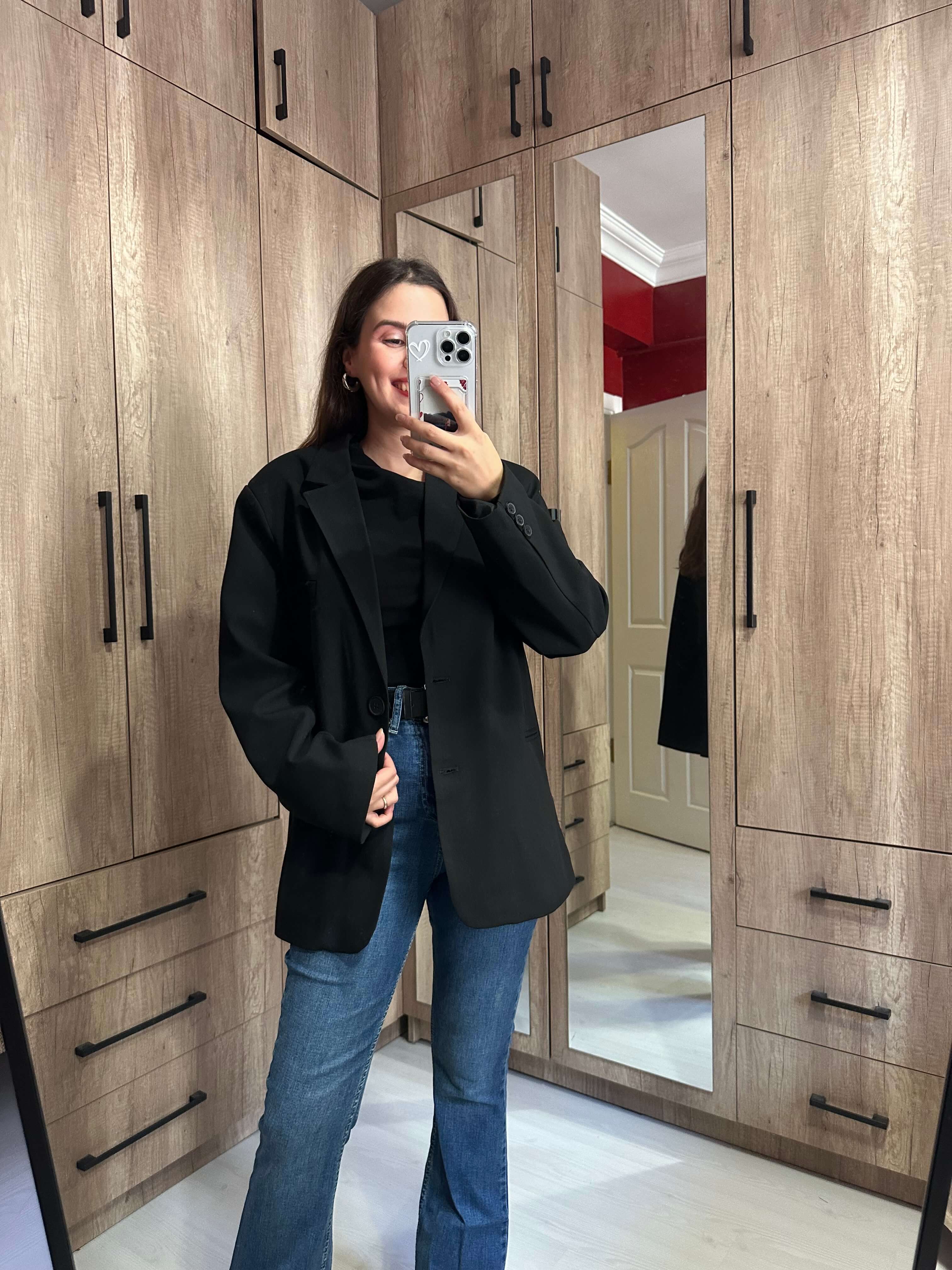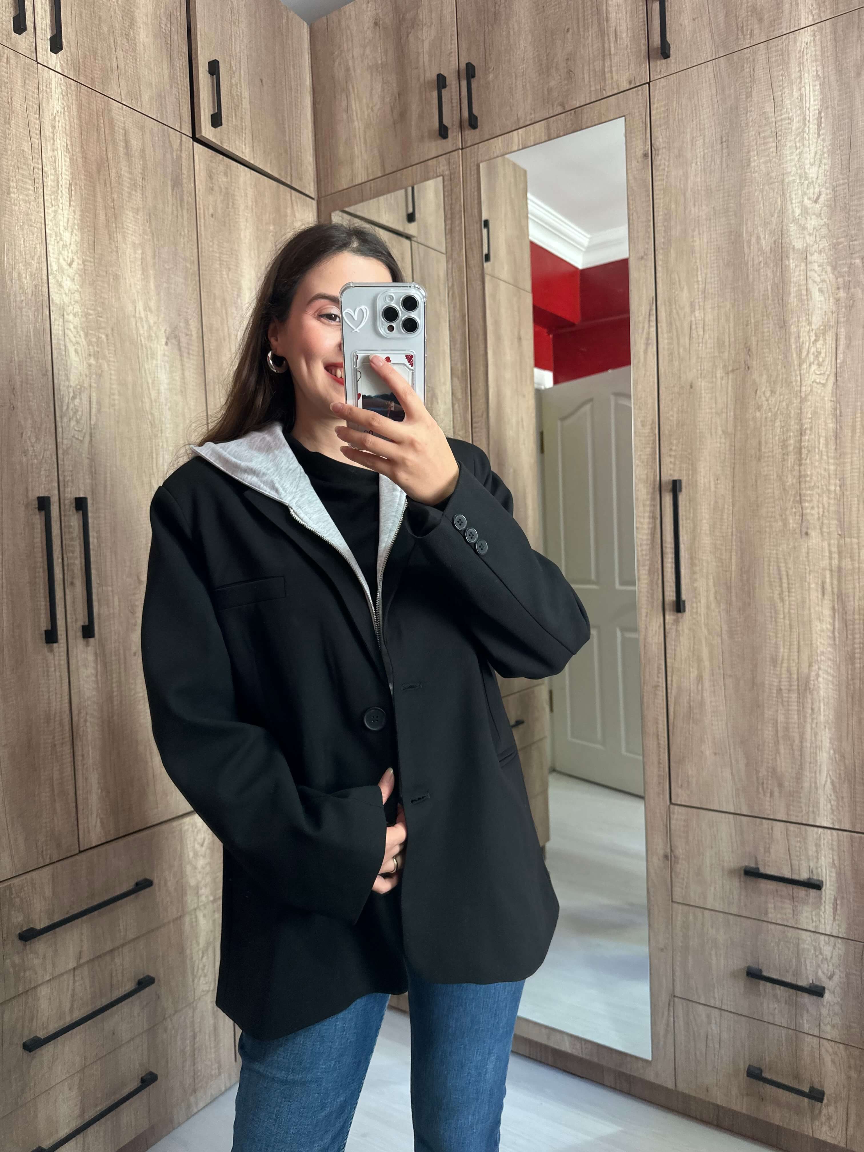 Kapüşonlu Sweat Detaylı Siyah Blazer Ceket
