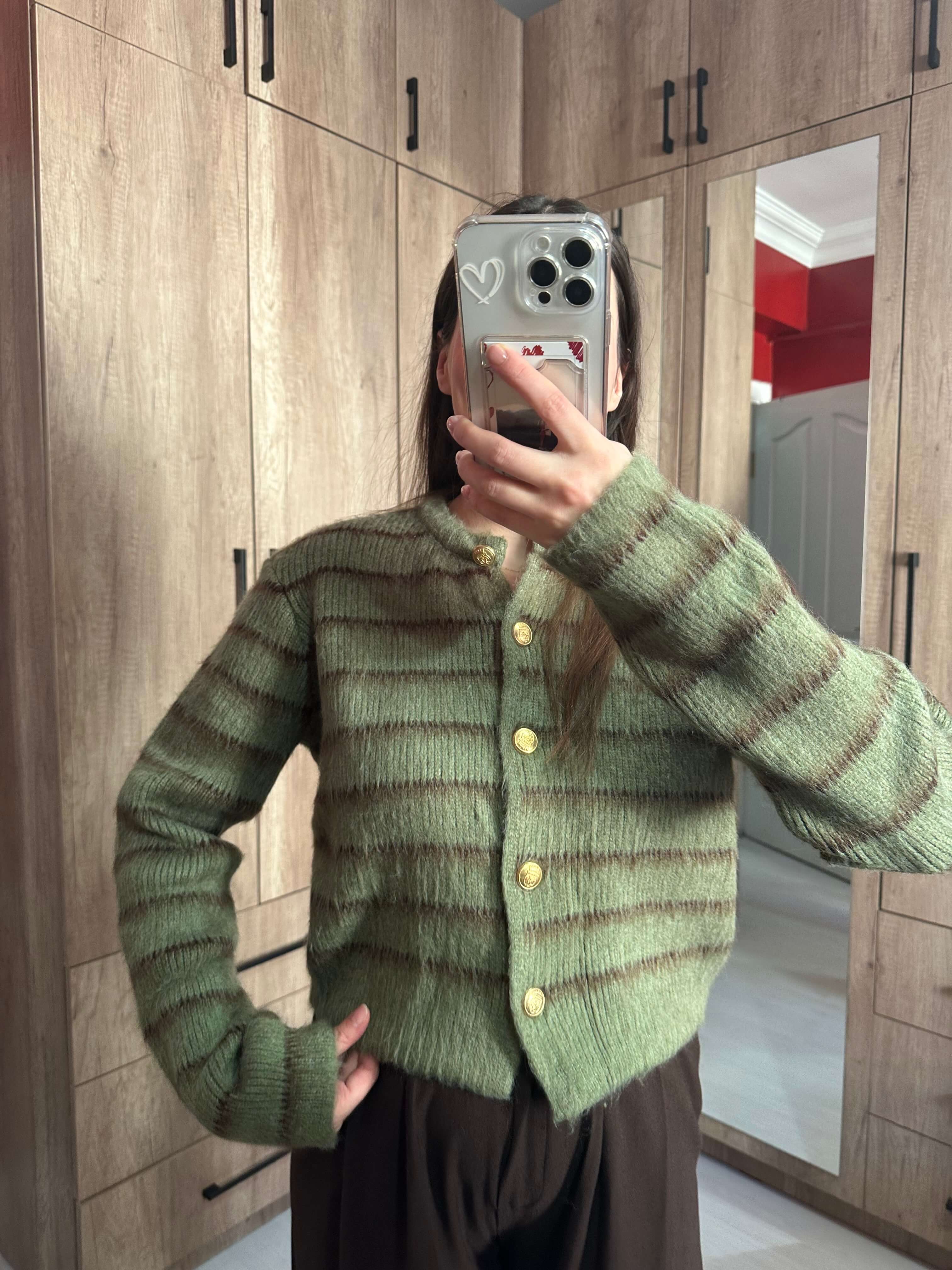 Zeytin Yeşili Ahşap Düğmeli Hırka
